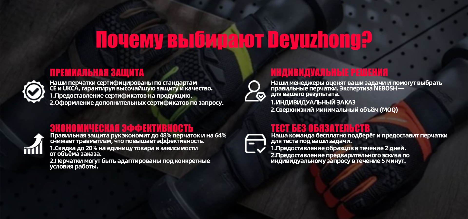аша миссия в компании DeYuZhong заключается в производстве самых инновационных и тщательно проверенных продуктов для обеспечения безопасности и производительности наших клиентов. Мы предоставляем полный спектр средств индивидуальной защиты, безопасности, инструментов и оборудования. Никто не работает больше, чем мы, чтобы служить и защищать профессионалов и сообщества по всему миру, и это обещание DeYuZhong.